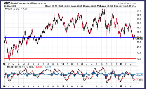 1 – Les minières reviennent à des niveaux de cours intéressants. Sous les 50 $ sur le GDX (cours actuel : 49 $), il faut commencer à s’intéresser de près au secteur. Entre 40 $ et 50 $ sur le GDX, nous sommes en zone d’achat sur les minières.